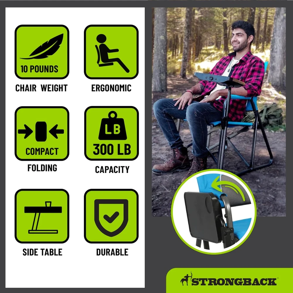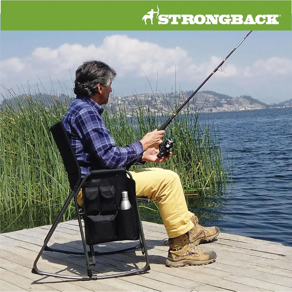 - The difference? All STRONGBACK folding patio and camp chairs have our award-winning, patented ergonomic design built into the frame of the chair itself. This design better aligns your body posture easing tension; with lumbar support for your back and a special seat designed to prevent leg pinch and align the hips. This system provides maximum comfort and relaxation