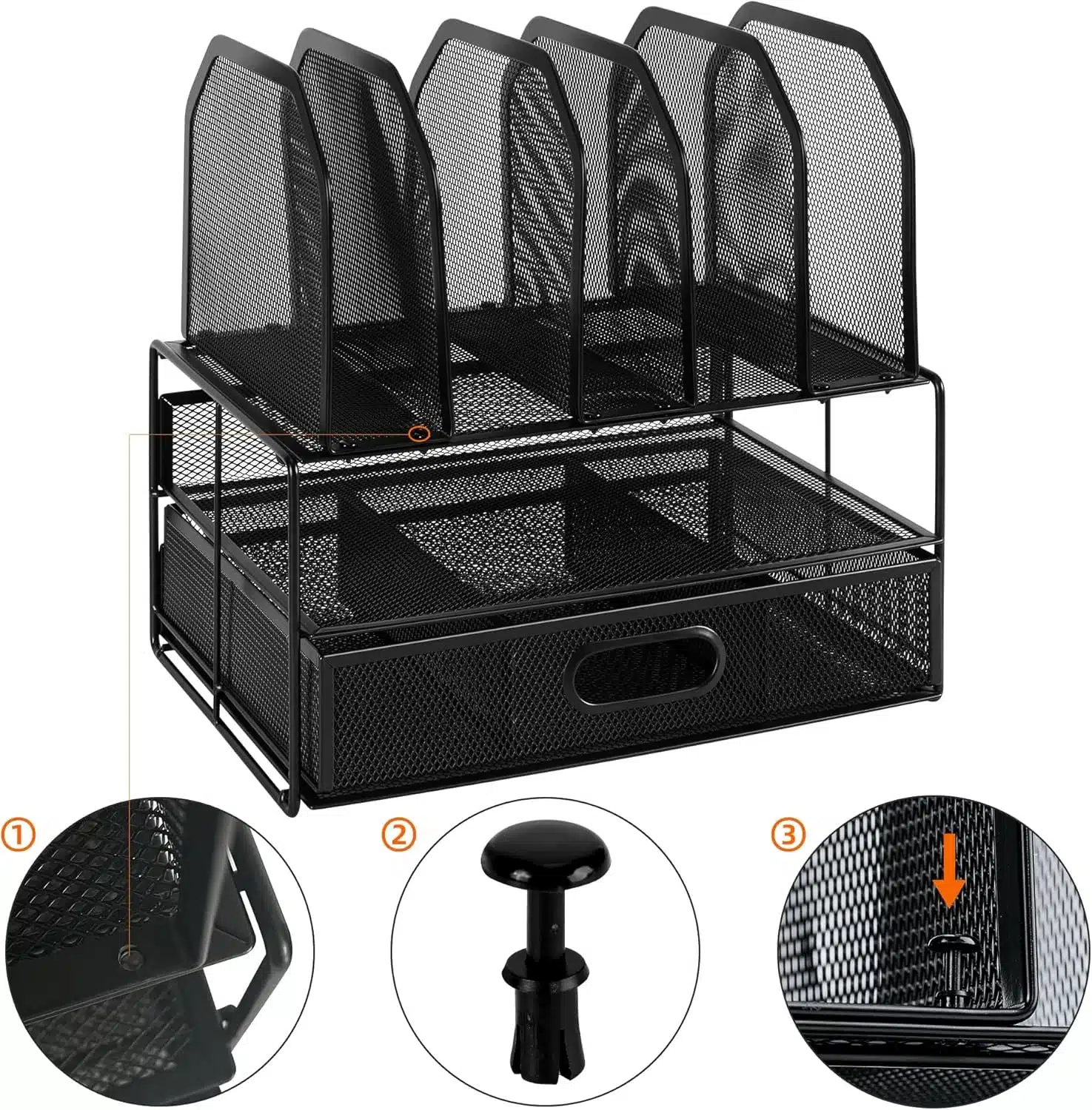 Amazon Basics Mesh Desk Organizer with Sliding Drawer, Double Tray and 5 Upright Sections, Black