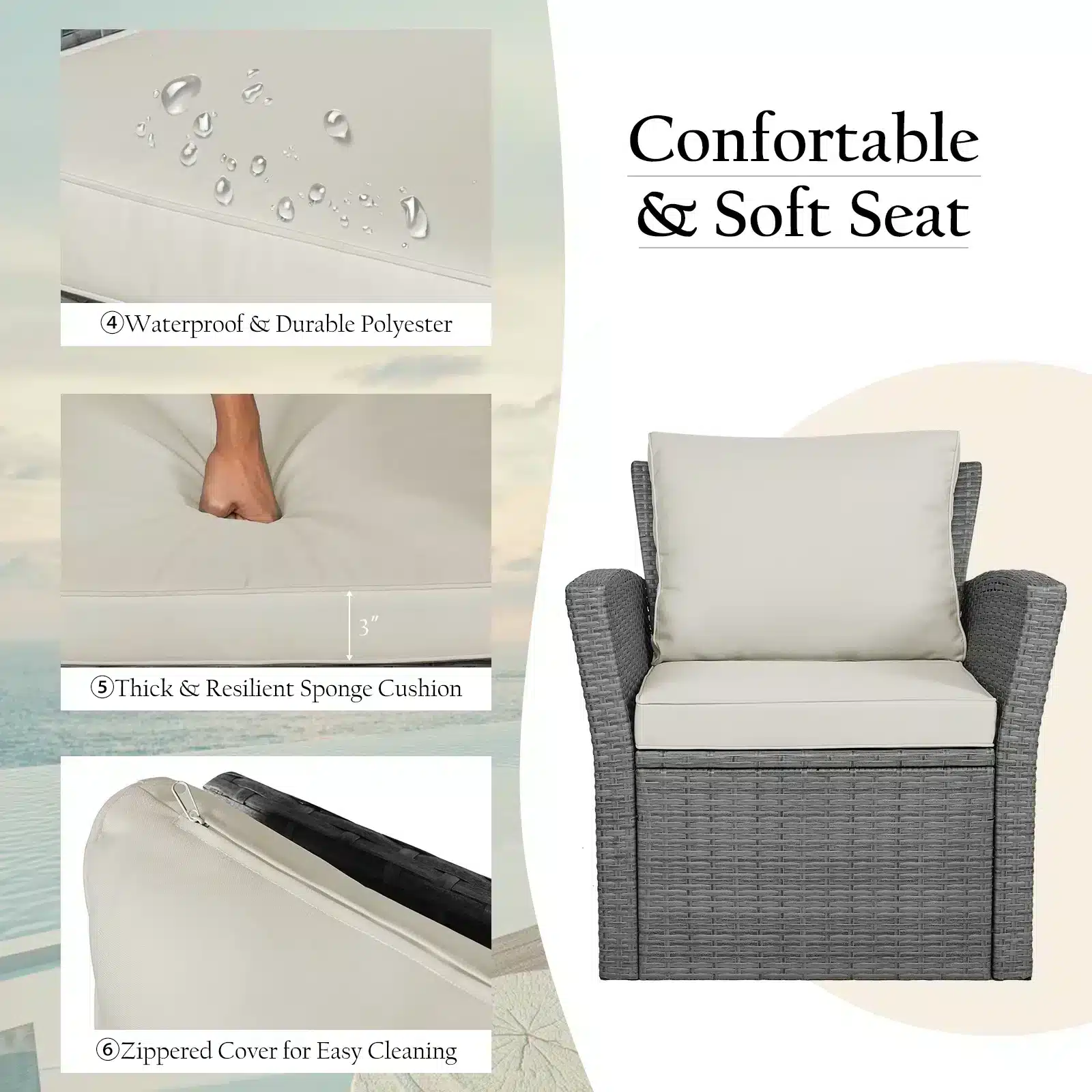 - Simple and stylish sofa set is ideal for any place, like courtyard, balcony and poolside.