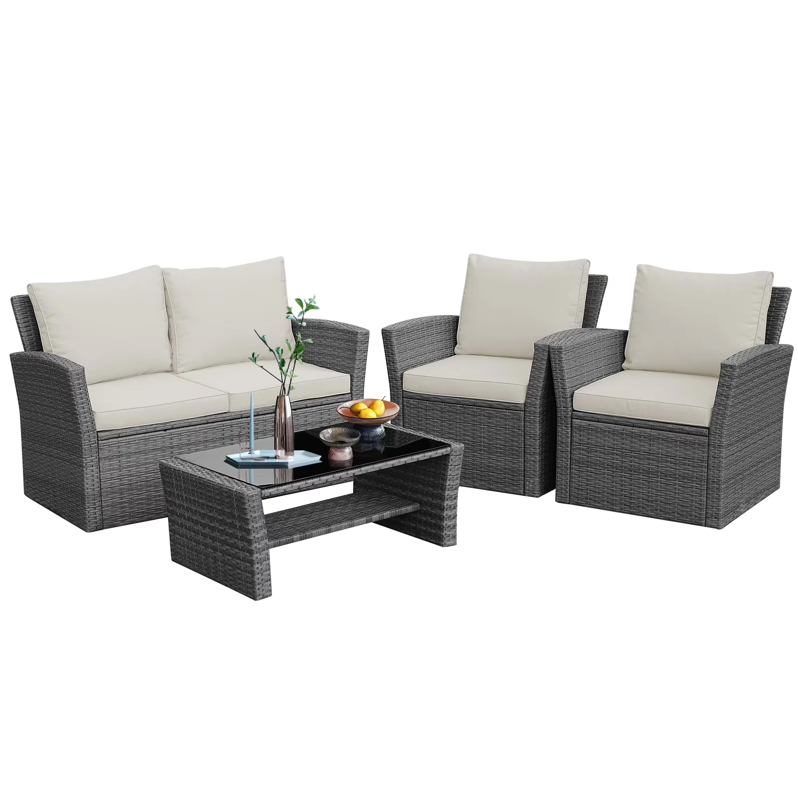 Featuring 2 armchairs, 1 loveseat and 1 coffee table with temper glass top, this patio sofa set can offer enough seats for 4-5 adults to enjoy outdoor leisure time and each piece of this set can be used individually or in combination. Made of premium wicker and a sturdy steel frame, this sofa set is sturdy and stable enough to withstand the test of time. Thick sponge cushions and wide armrests can provide a comfortable sitting experience for you. Equipped with zippers, the covers of cushions are easy to remove and clean. Besides, the table top is made of tempered glass, so you can wipe it off with damp cloth after use. Thanks to the modern and simple design, this rattan furniture set can be placed in your courtyard, balcony and poolside to have a gathering or conversation with your family or friends.