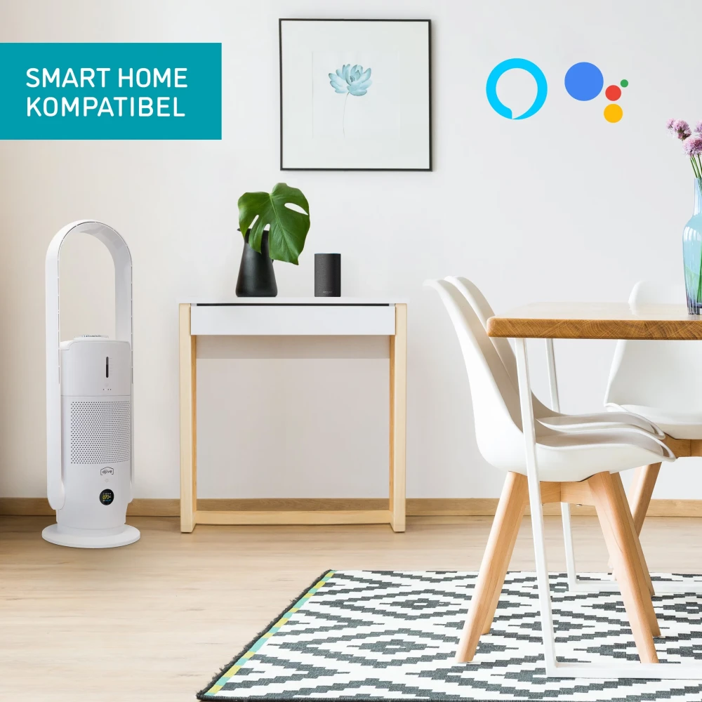 The Djive Humidifier DJ50018 is a tower fan that not only provides targeted ventilation but also features air humidification and purification functions. Equipped with a HEPA filter and UV disinfection, it is particularly effective for allergy sufferers, eliminating 99.995% of all allergens in rooms up to 25 m². With an operating noise level of just 29 dB, the fan ensures a peaceful sleep. The intuitive control is managed through the Djive Home App or smart home assistants like Alexa, allowing for customizable settings such as the automatic sleep mode. Additionally, the humidifier automatically adjusts to the room’s humidity with its auto function and integrated hygrometer.