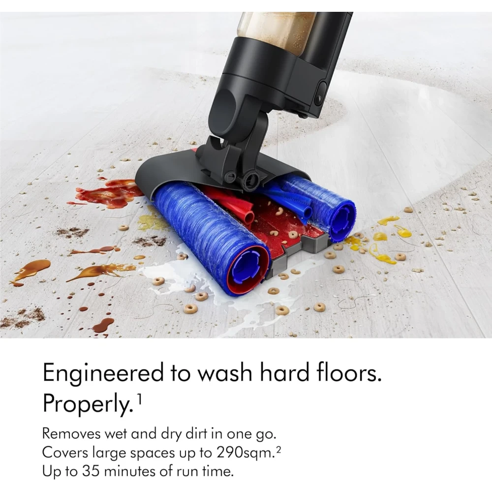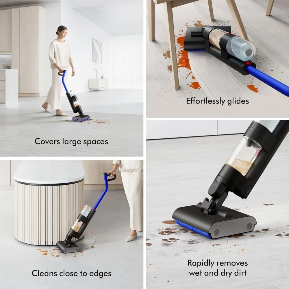 - Glides and goes low, effortlessly Double rollers spin in opposite directions, so Dyson WashG1 wet cleaner feels easy to manoeuvre. It’s also designed to reach low under furniture and into awkward spaces. The Dyson WashG1 cleaning a large food spillage from under a dining table
