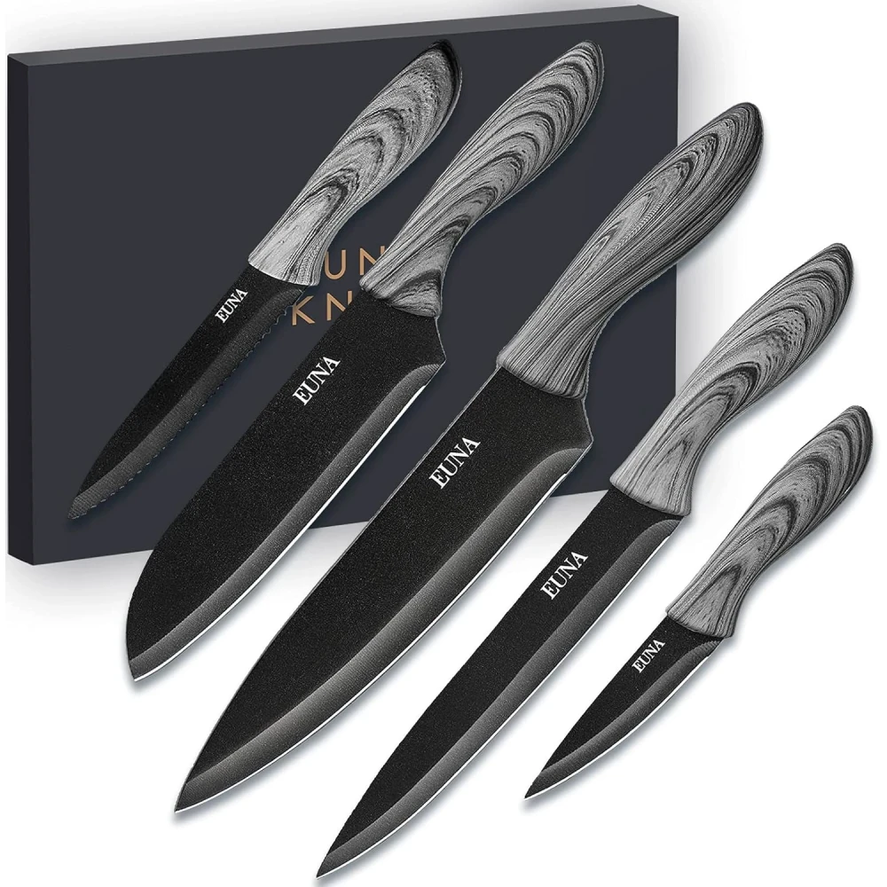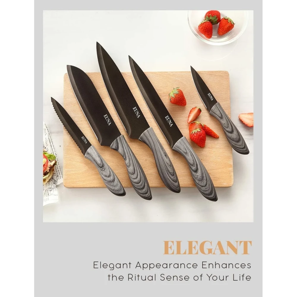- PACKAGE & NOTICE – EUNA cooking knife set comes with a protective cover and premium box, making it an ideal gift for professionals and beginners alike. Please Notice: Our knives may experience coating peeling after prolonged use. Rest assured, this coating is made from food-safe materials. We are optimizing the manufacturing craftsmanship to address this issue. We sincerely apologize for any inconvenience caused by this matter. Let us know if you encounter any issues!