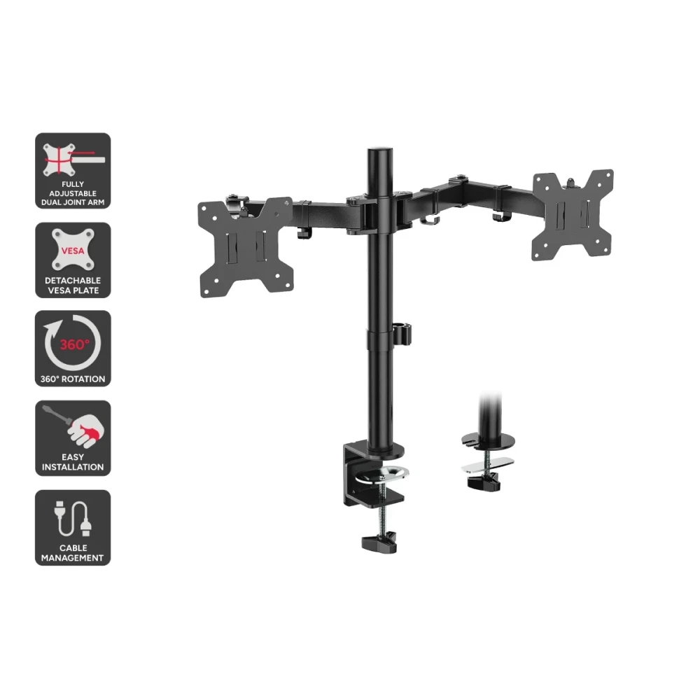Enhance your work environment with the Kogan™ Articulating Dual Monitor Arm for 17”- 32” Monitors, offering ergonomic flexibility, versatile viewing options, and a cable management solution to optimise productivity and comfort for your dual-monitor setup.