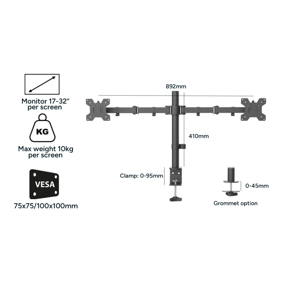 - Supports 2 monitors ranging from 17” – 32” and weighing up to 10kg each