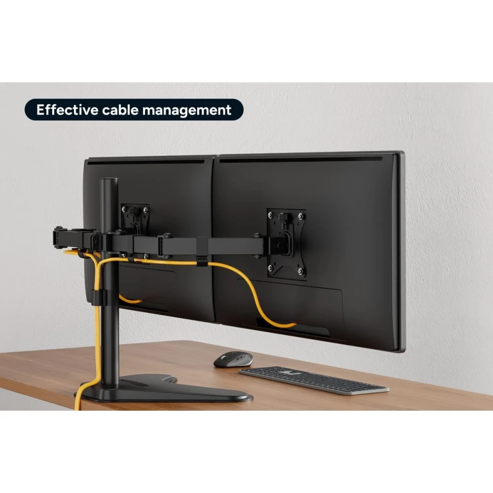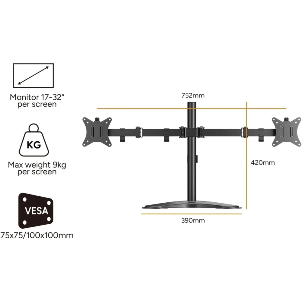 Versatile compatibility to elevate your setup This dual monitor stand accommodates 17″ to 32″ monitors, supporting both flat and curved screens up to 9kg per arm. Its robust steel construction ensures stability, making it ideal for heavy-use environments like offices and gaming setups. Whether you have multiple documents open or your game and streaming software, this dual monitor stand is up to the task.