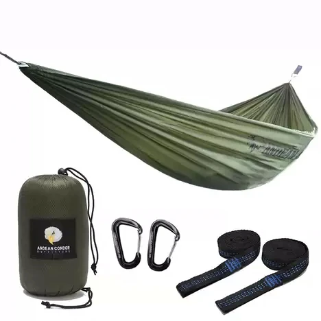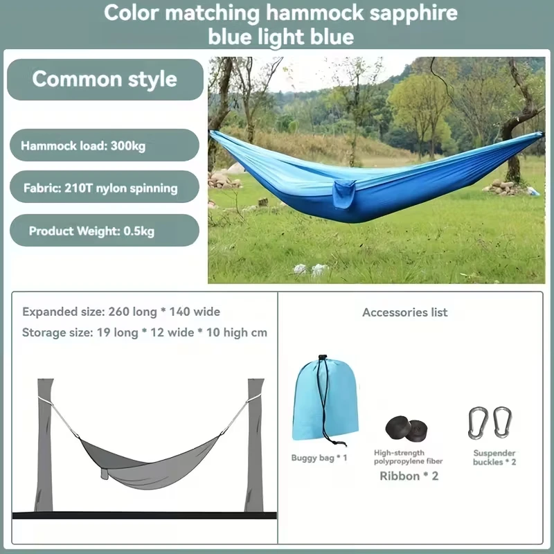Relax anywhere with this lightweight parachute nylon hammock, built to support up to 300 kg. Includes strong tree straps and carabiners for quick setup — no tools needed! Perfect for camping, hiking, beach, and backyard.