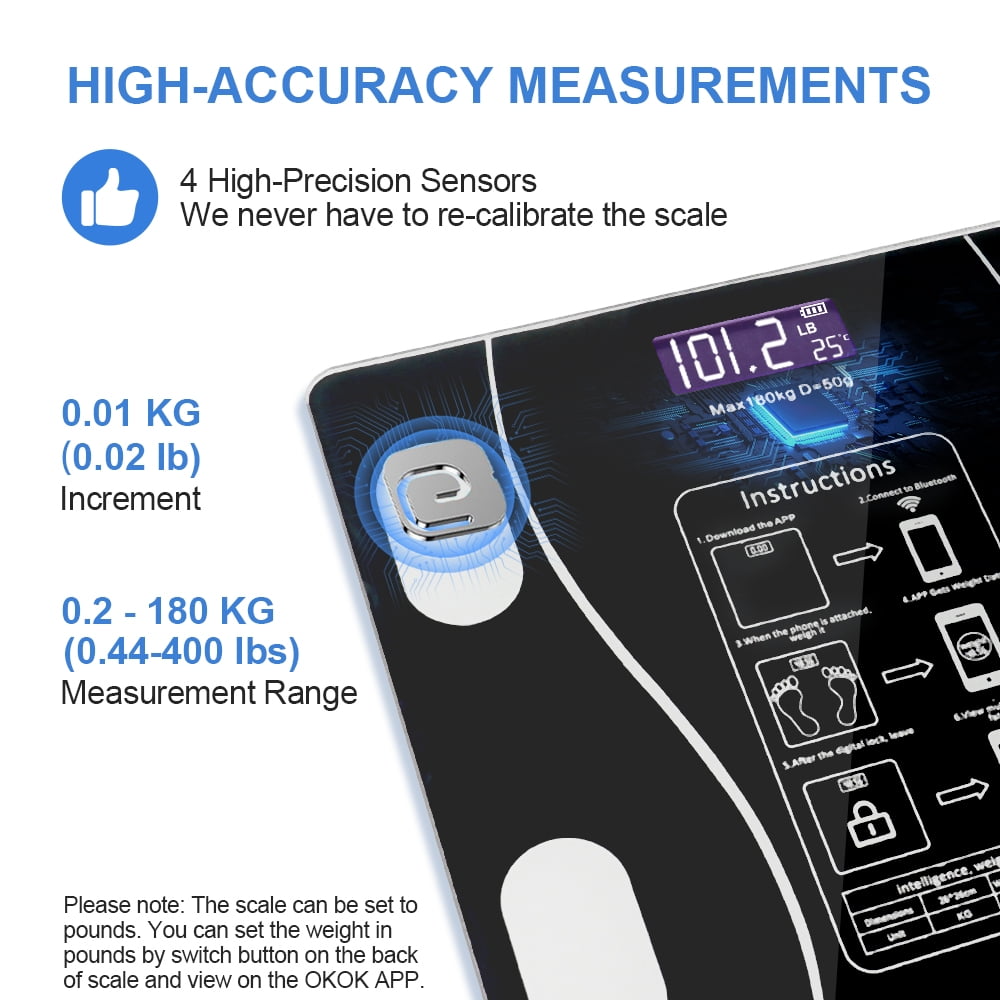 The scale is equipped with 4 high-precision sensors to provide accurate measurements down to a 0.02 lb (0.01 kg) graduation.The scale will recognize you based on past stored readings and holds up to 8 personal profiles.