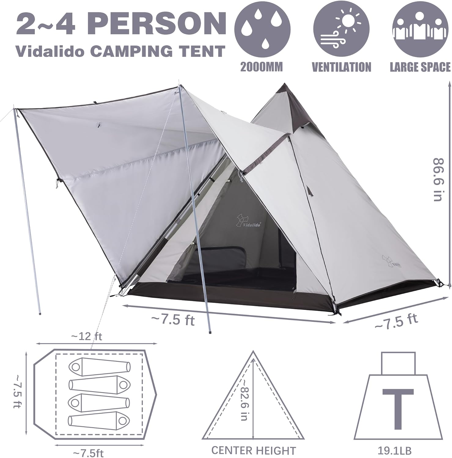 - ROOMY FOR 2-4 PERSON TENT: The pop up tent is perfect for 2-4 person outdoor camping. With the size of ~7.5ft x 7.5ft x 82.6in(H) (~56.25 sq ft). 1 queen air mattresses (6.7ft*5ft/200cm*150cm,) or 2-4 sleeping bags are well fit in the tent. With Vidalido new patent design (without center pole inside), the camping tent provide a roomy space, you can stand in or move inside the tent comfortably. Ideal for family outdoor camping.