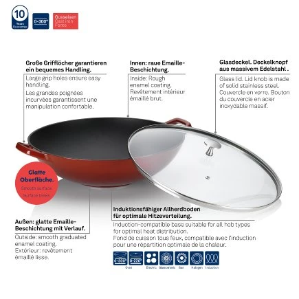 Wok 36 cm diameter, cast iron with glass lid, Ø 36 cm, 4 L. Height 10 cm. Usable up to 220° C, without lid up to 300° C. Shiny.