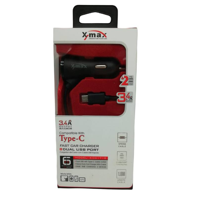 X-Max Fast Car Charger with Dual USB Port & Type-C Cable – 3.4A Output (Model X-CC1718)